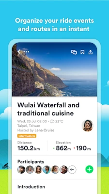 Create cycling events with necessary information like route, elevation, gathering spot, and invite friends to join! Every team member will be notified upon any modification to the event.