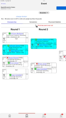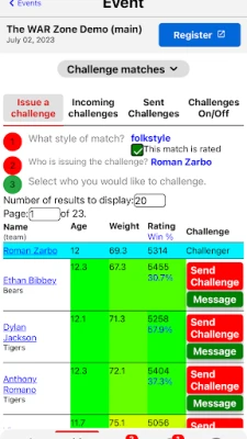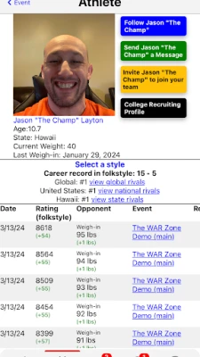 The Wrestling Tournaments app from WrestlingTournaments.com provides athletes, coaches, and spectators with a smooth experience at wrestling events. This app will help you to know the start time of every match, view brackets, send challenge matches, manage your team, send direct messages, view the profiles of other wrestlers, analyze your statistics, and more.